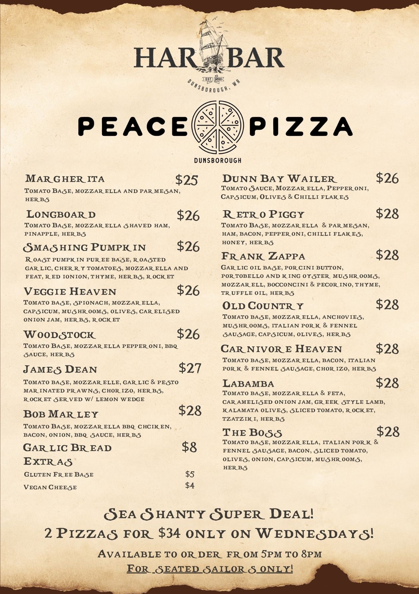 We've teamed up with the scurvy scoundrels at Peace Pizza Dunsborough to bring you the best pizza in the south west, served in house only at Har Bar! Available between opening and 8pm daily.